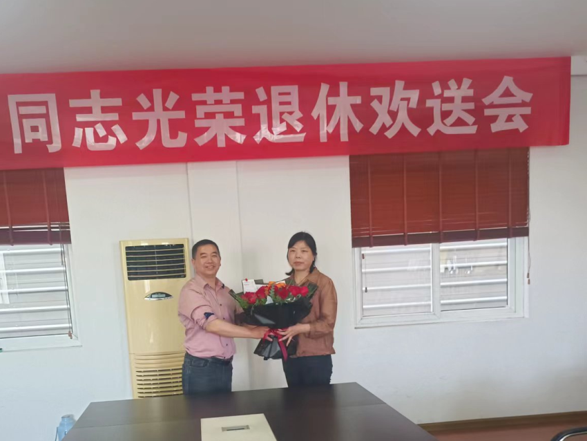 鸟语花香,春风拂面,2023年4月20日公司举行了一场隆重的退休欢送会,为员工曾庆月送去的祝福。公司工会主席艾瑞义、副总经理梁华友、各职能部门经理成员出席并表示祝贺。